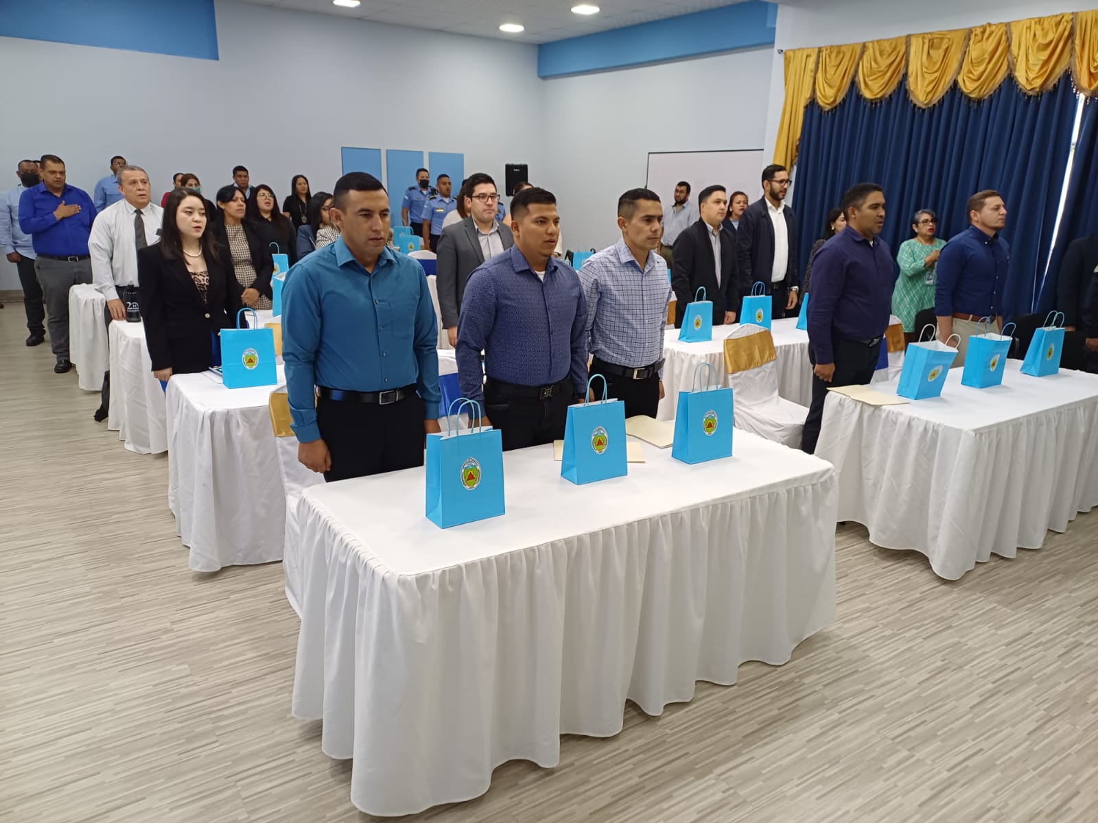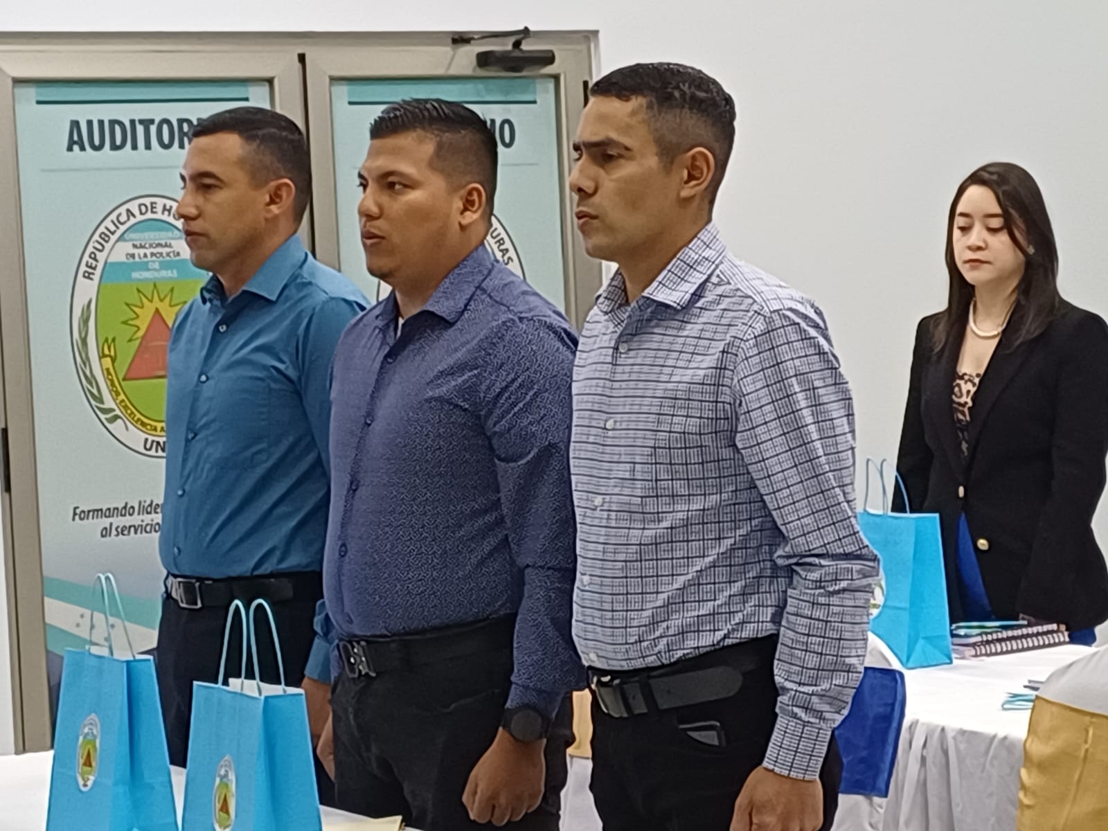 En la mesa principal estuvo el Señor Director de la Policía Nacional, General Director, Manuel Aguilar Godoy; Comisionado General, Reinaldo Servellón Castillo, Rector de la UNPH; Comisionado de Policía, Juan González Zapata, Director del IPEEE; Master Kadoya Atsunori, representante de JICA en Honduras; Master Fausto Calix, Director de Aduanas, entre otros.